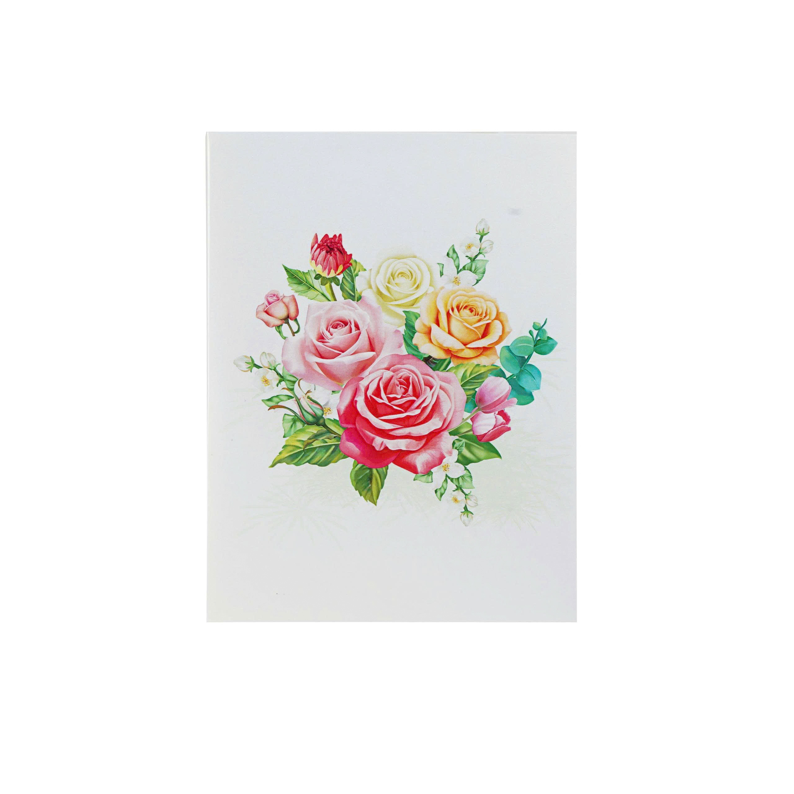 The Blooming Roses Pop-Up Card is a stunning 3D greeting card designed to capture the beauty of a blooming garden in full color. When opened, the card reveals an abundant bouquet of roses in soft pastel shades, including pink, cream, yellow, and coral tones, delicately arranged with fresh green foliage.