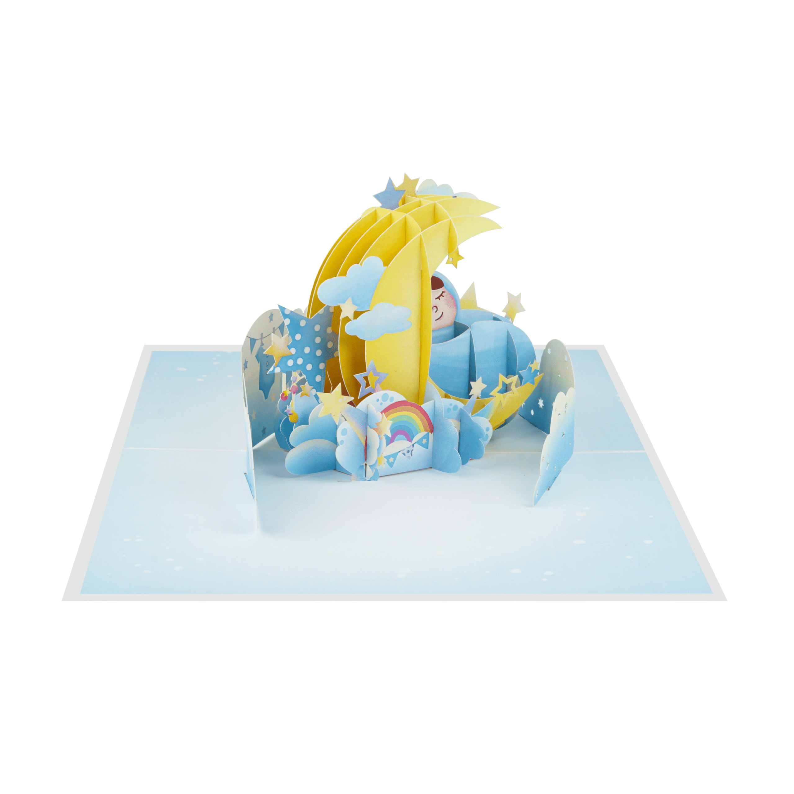 The Blue Baby Pop-Up Card is a sweet and soothing design created to celebrate the arrival of a newborn baby boy or a gender-neutral baby moment. When opened, the card reveals a peaceful 3D scene of a sleeping baby wrapped in soft blue tones, resting beneath a glowing crescent moon and surrounded by fluffy clouds, stars, and a pastel rainbow.
