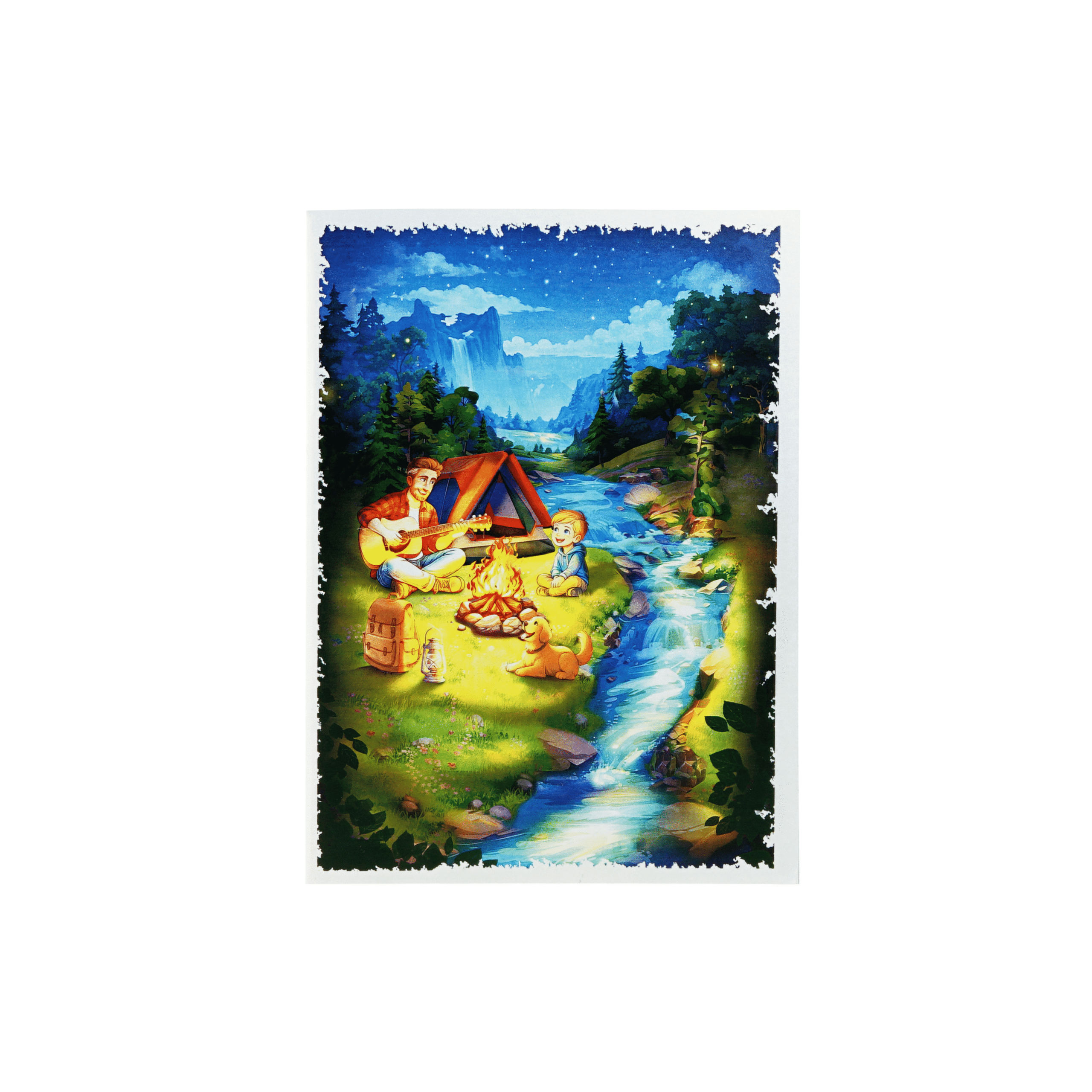 At the heart of the scene, a father plays guitar beside the glowing fire while a child and their loyal dog listen happily, creating a touching moment of family bonding under the open sky. The soft lighting of the campfire adds warmth to the surrounding nature, bringing the entire story to life.