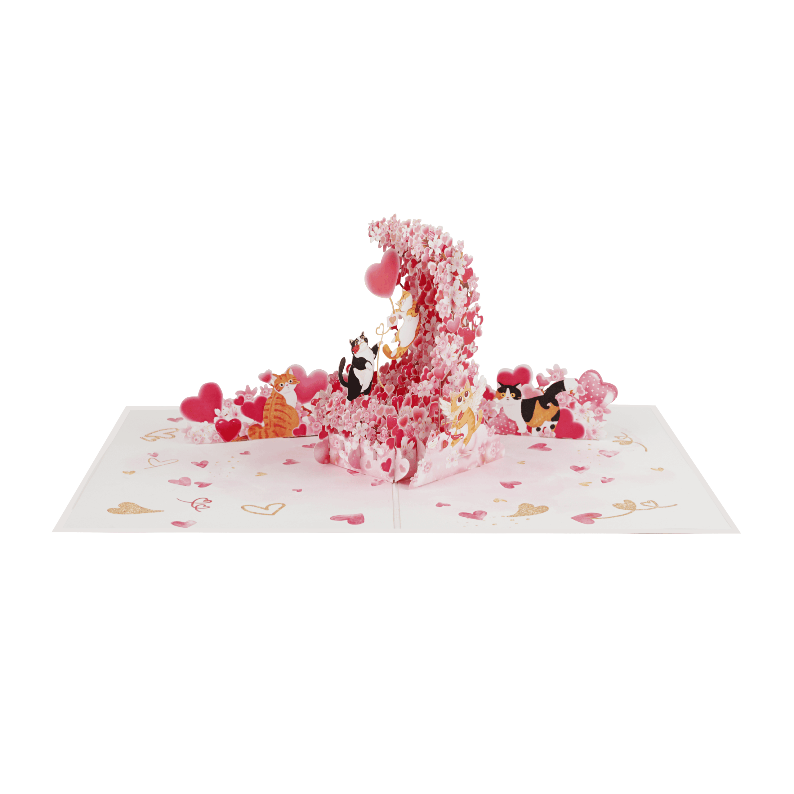 When opened, an enchanting scene unfolds – adorable cats surrounded by blooming pink cherry blossoms and floating hearts. Each detail, from the heart-shaped petals to the cheerful cats, is meticulously handcrafted to express warmth and affection.