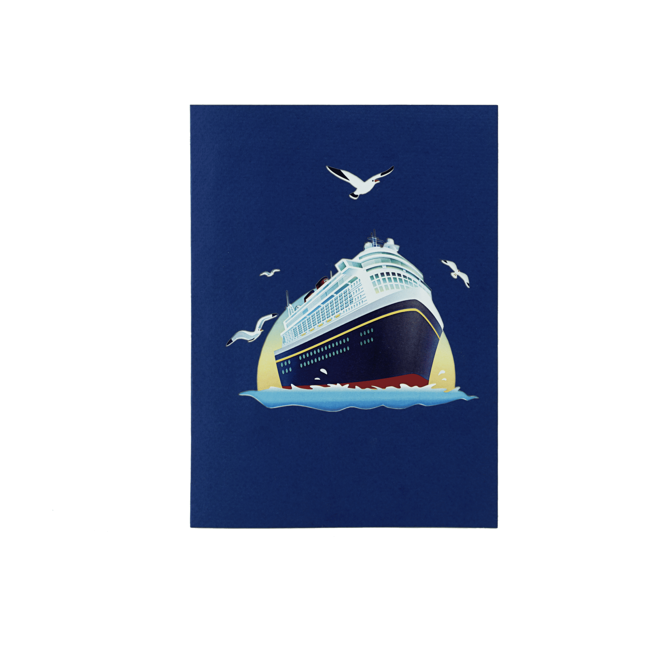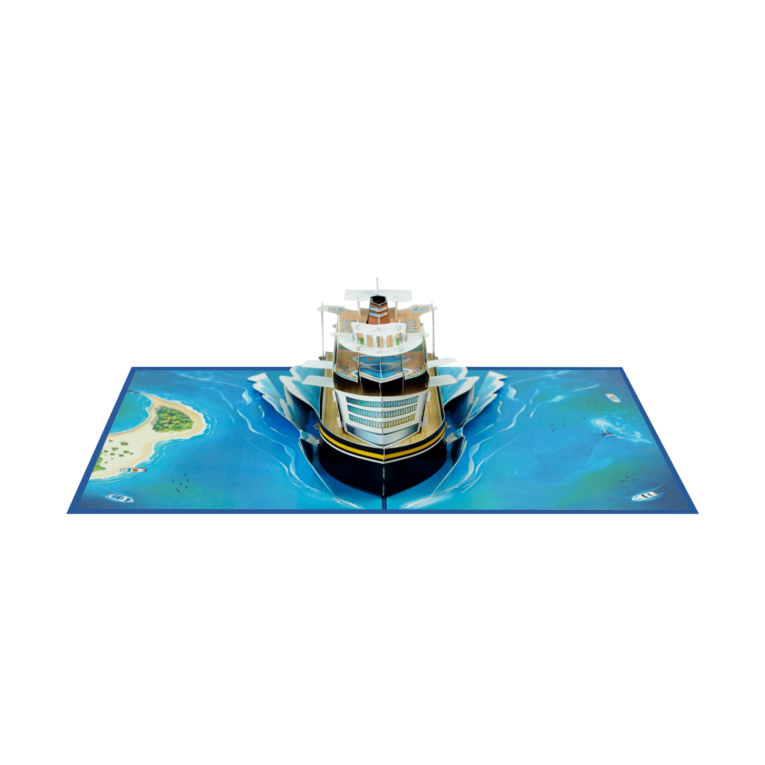 When opened, the card reveals a dramatic cruise ship rising from the sea, surrounded by crystal-blue waters, tropical islands, and flying seagulls — delivering a powerful visual impact that instantly evokes adventure and escape.
