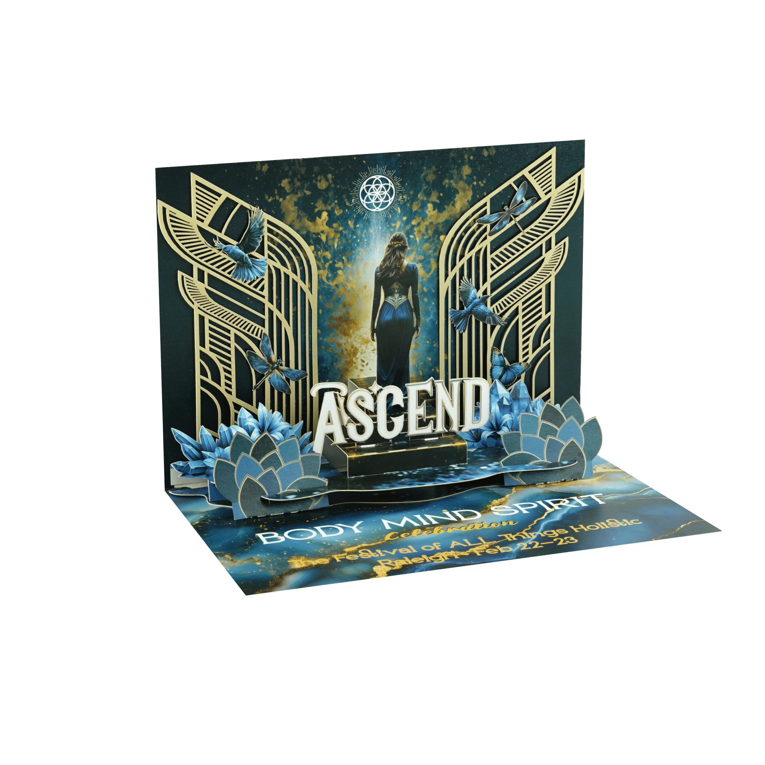 Create a powerful first impression with a fully customized 3D pop up invitation card designed for large-scale events and brand activations. This project was developed for the Body Mind Spirit Celebration – ASCEND Festival, showcasing a bold and immersive stage-inspired 3D structure.