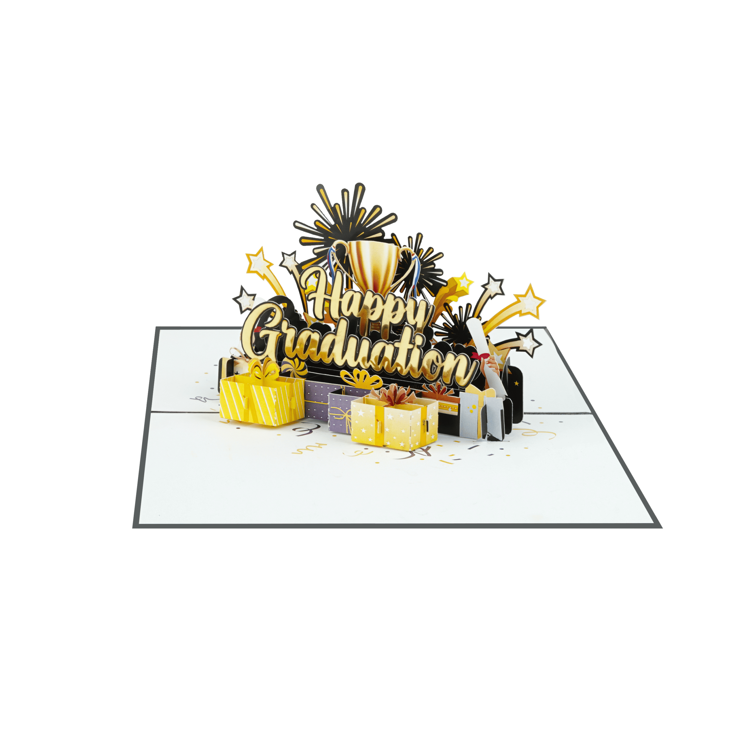 The Happy Graduation Pop-Up Card is a vibrant 3D greeting card created to celebrate academic achievements and memorable milestones. When opened, the card reveals a striking pop-up scene featuring a golden trophy, colorful gift boxes, sparkling stars, and fireworks, symbolizing success and celebration.
