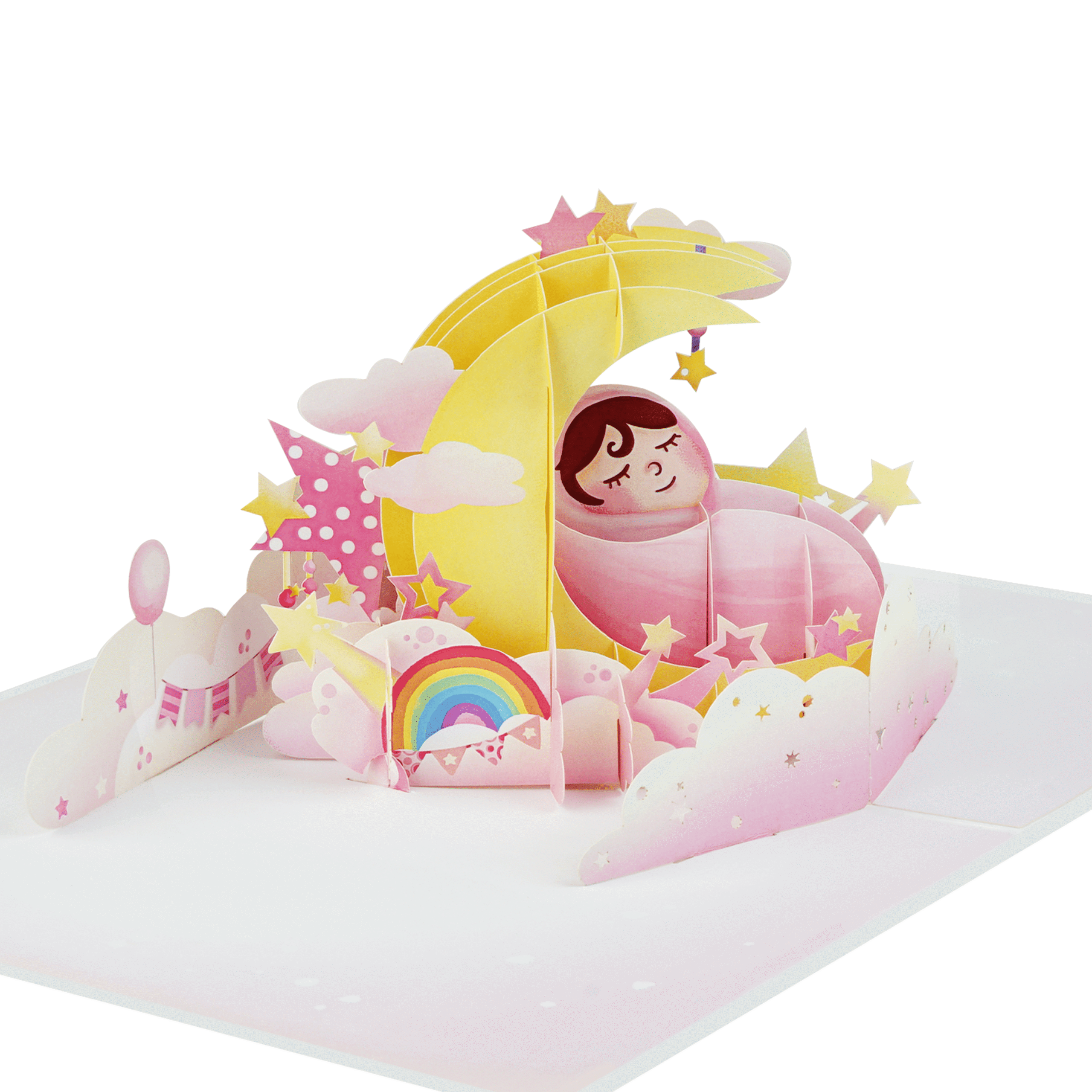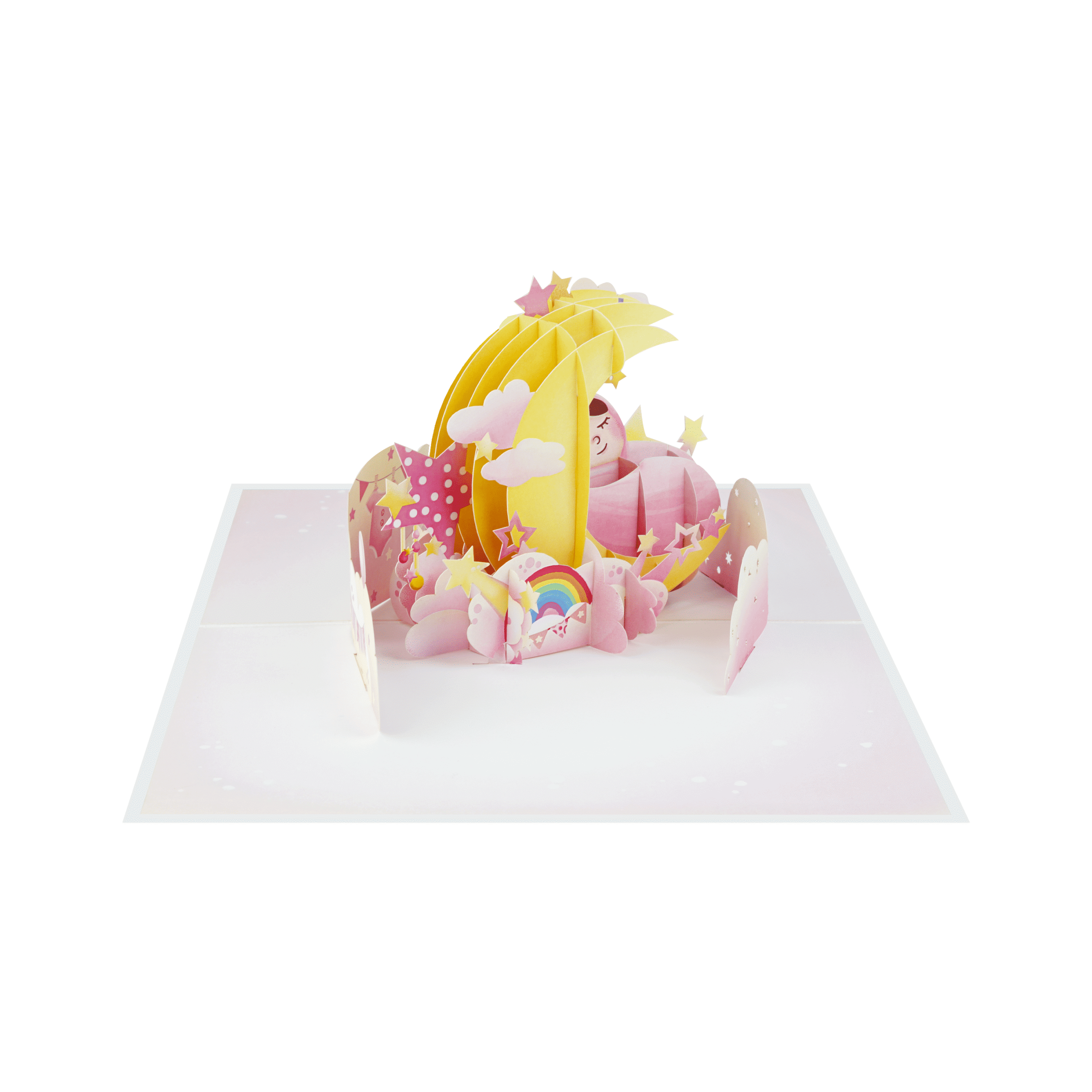 The Pink Baby Pop-Up Card is a gentle and heartwarming design created to celebrate the arrival of a newborn baby. When opened, the card reveals a charming 3D scene of a sleeping baby nestled under a crescent moon, surrounded by soft clouds, twinkling stars, and a pastel rainbow.